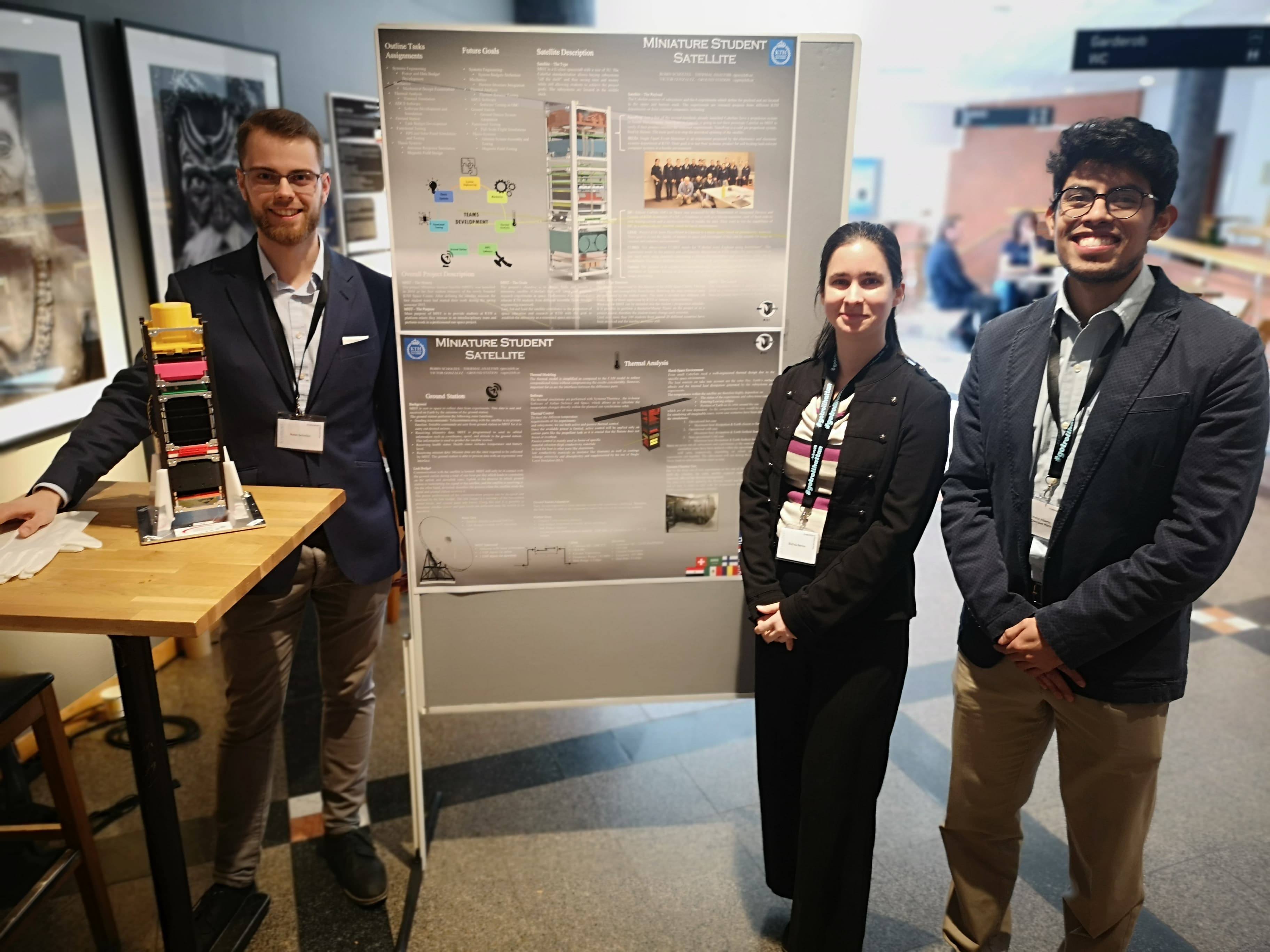 The Swedish Space community regularly holds gatherings to exhange ideas. This year, the event “Rymdfoum” was held in the town of Trollhättan on 24-26 March 2019. Trollhättan is the home of GKN Aerospace, the maker of jet engines and important parts of rocket engines for the Ariane launch vehicle family. The MIST project had a poster and was represented by three students. From the left: Robin Scholtes, Borbala Bernus and Victor Gonzales.
