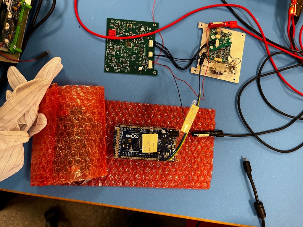The top left printed circuit board contains the SiC transistor test experiment and support electronics for the piezoelectric linear motor experiment on the upper right. The circuit board on the red bubble plastic is the Arduino-based simulator of the on-board computer. The picture was taken in the MIST Functional testing lab at the main campus.