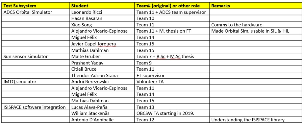 Many students have worked on the preparations for the HIL simulations over the years, and their names appear in the table below. Some students have worked on various test subunits.