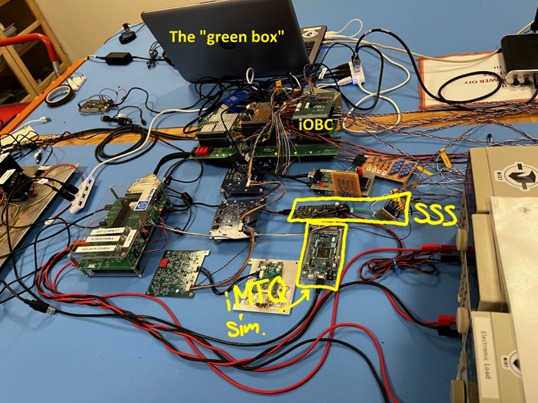 The picture below shows the devices in the sketch above as they look in real life in the MIST integration laboratory. SSS=Sun sensor simulator, iMTQ sim.=Simulator of the iMTQ device made by ISISPACE: magnetometer and magnetic torquers, iOBC=the onboard computer flight model, “The Green Box” refers to the block with a green outline in the schematic description of the HIL setup..