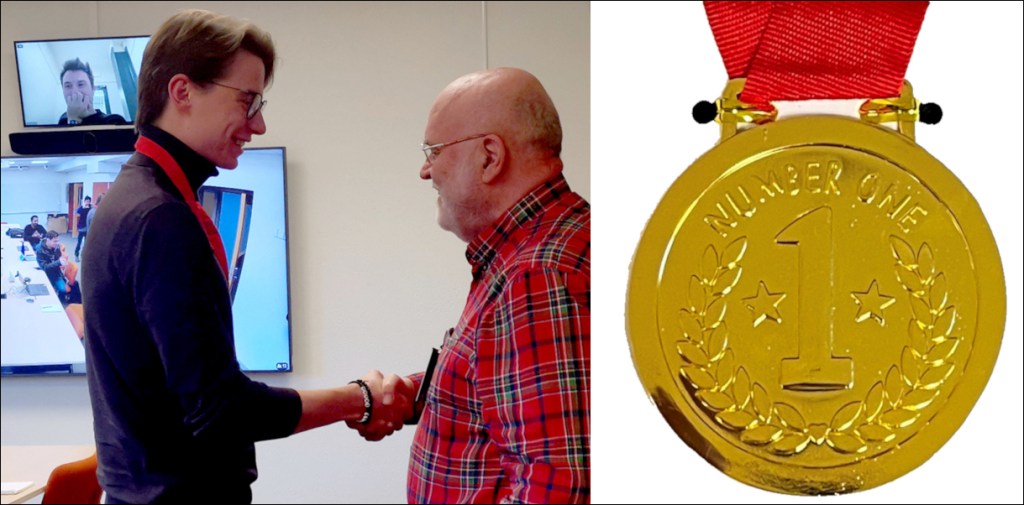 The student who has had as his task during 2022 to make the HIL simulation work is Mathias Dahlman. In this work he has of course had help from other students, but Mathias was the student that had to suffer the indignity of reporting, at every project meeting, that the HIL simulations still didn’t work. For enduring this ordeal he was given a toy medal by the MIST project manager at the 30 November 2022 project meeting (see picture below)!