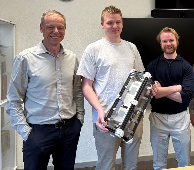 B.Sc. thesis students Nils Kiefer and Casper Melander pose with their project product – a universal transport box for 3U Cubesats. KTH Space Center director and astronaut Christer Fuglesang was present at the meeting.